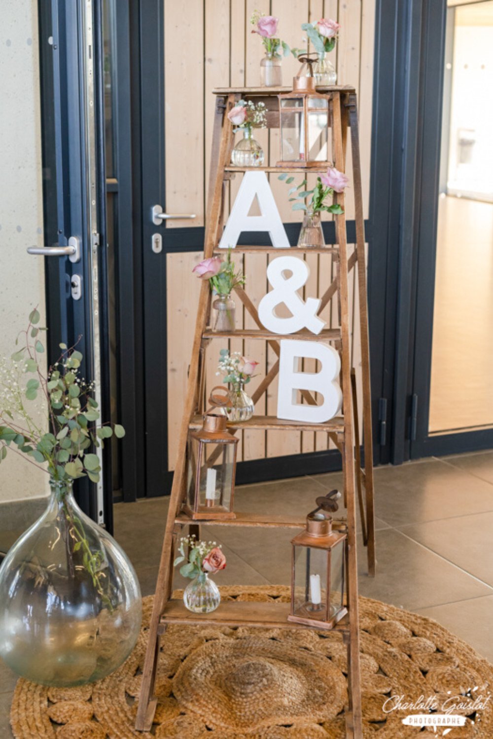 À l’entrée de la salle, nous avons disposé un escabeau de peintre, avec quelques objets : des vases, des fioles fleuries, des lanternes, des bougies en cuivre, de grandes lettres blanches “ A & B”, une dame Jeanne fleurie et un tapis en jute pour délimiter l’espace.
