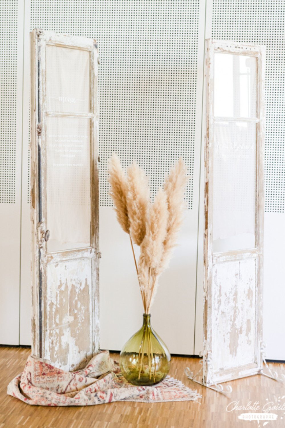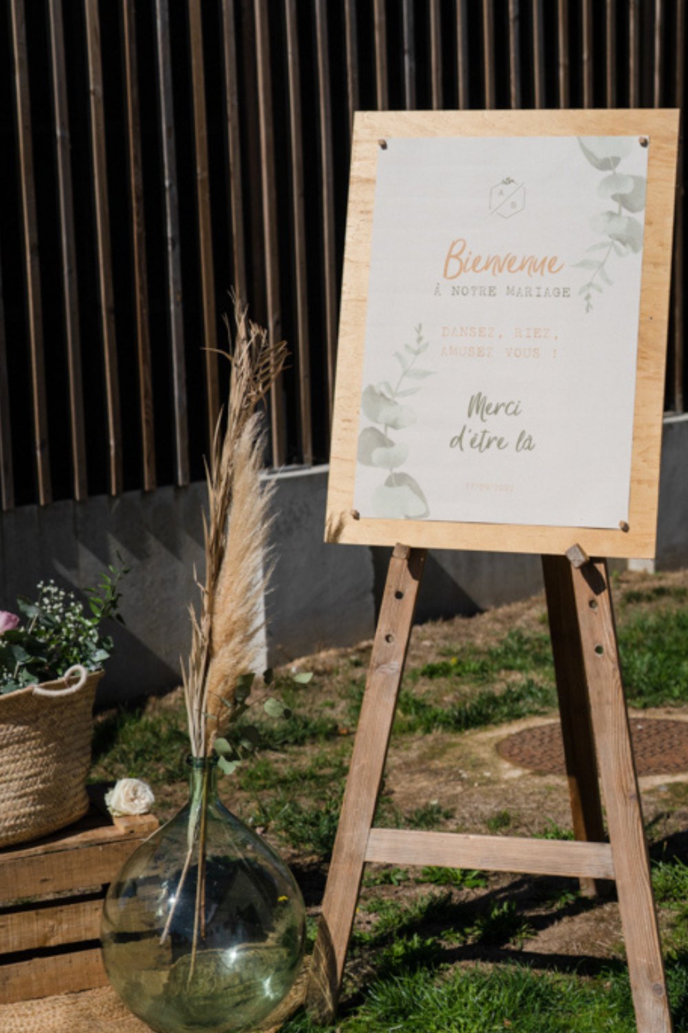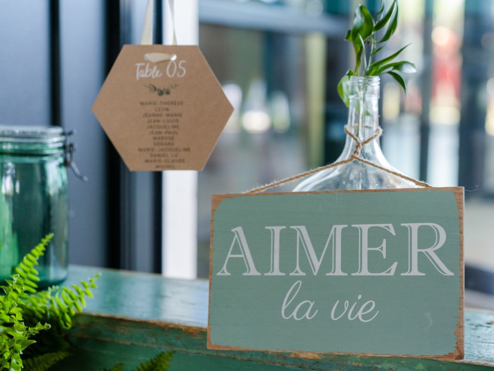 Les mariés avaient apporté des cadres et des panneaux en bois avec des citations inspirantes : “AIMER la vie”, “Les jolies choses se font avec BEAUCOUP d’amour et de patience”.