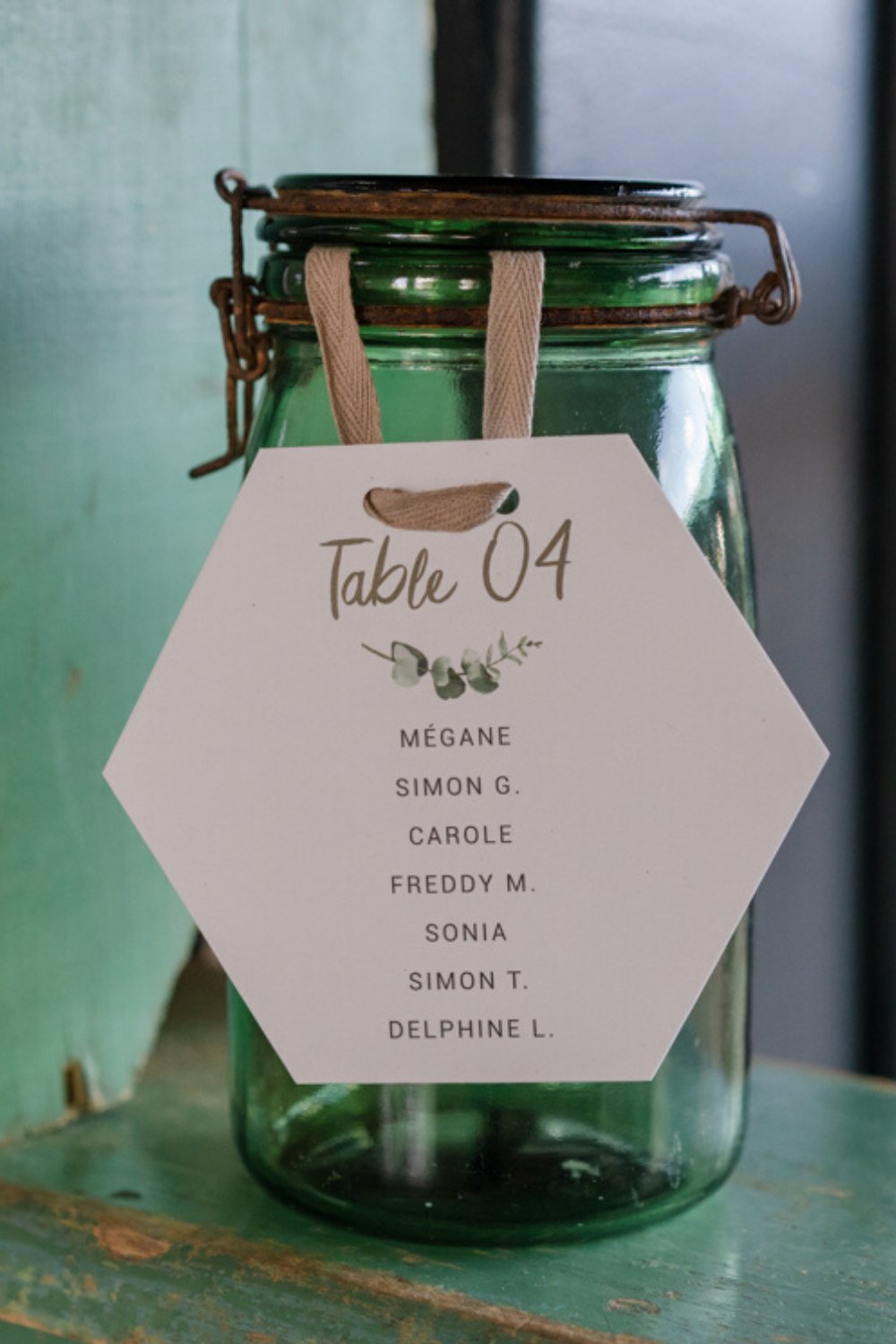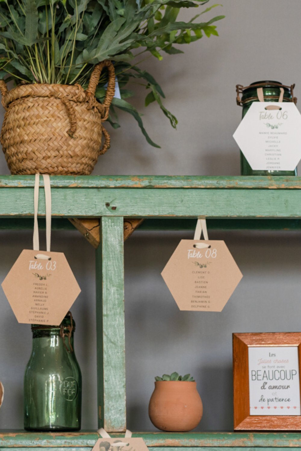 Le prénom des invités était imprimé sur des fiches de formes hexagonales en papier épais dans différentes couleurs (beige ou kraft). Nous pouvions y retrouver la typographie, sélectionnée par les mariés sur toute leur papeterie (faire-part, livrets de mariage, signalétiques, marque-places…), ainsi que le dessin d’une branche d’eucalyptus, également présent sur toutes les déclinaisons.