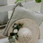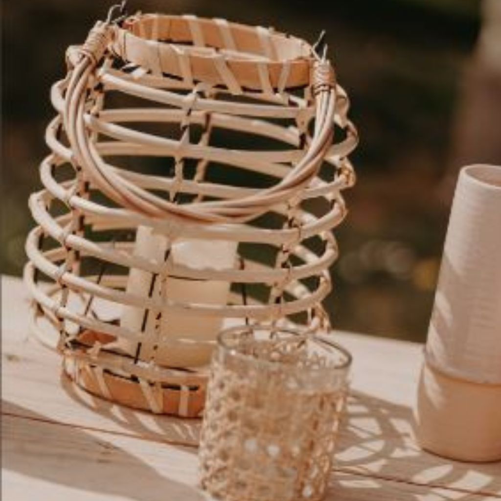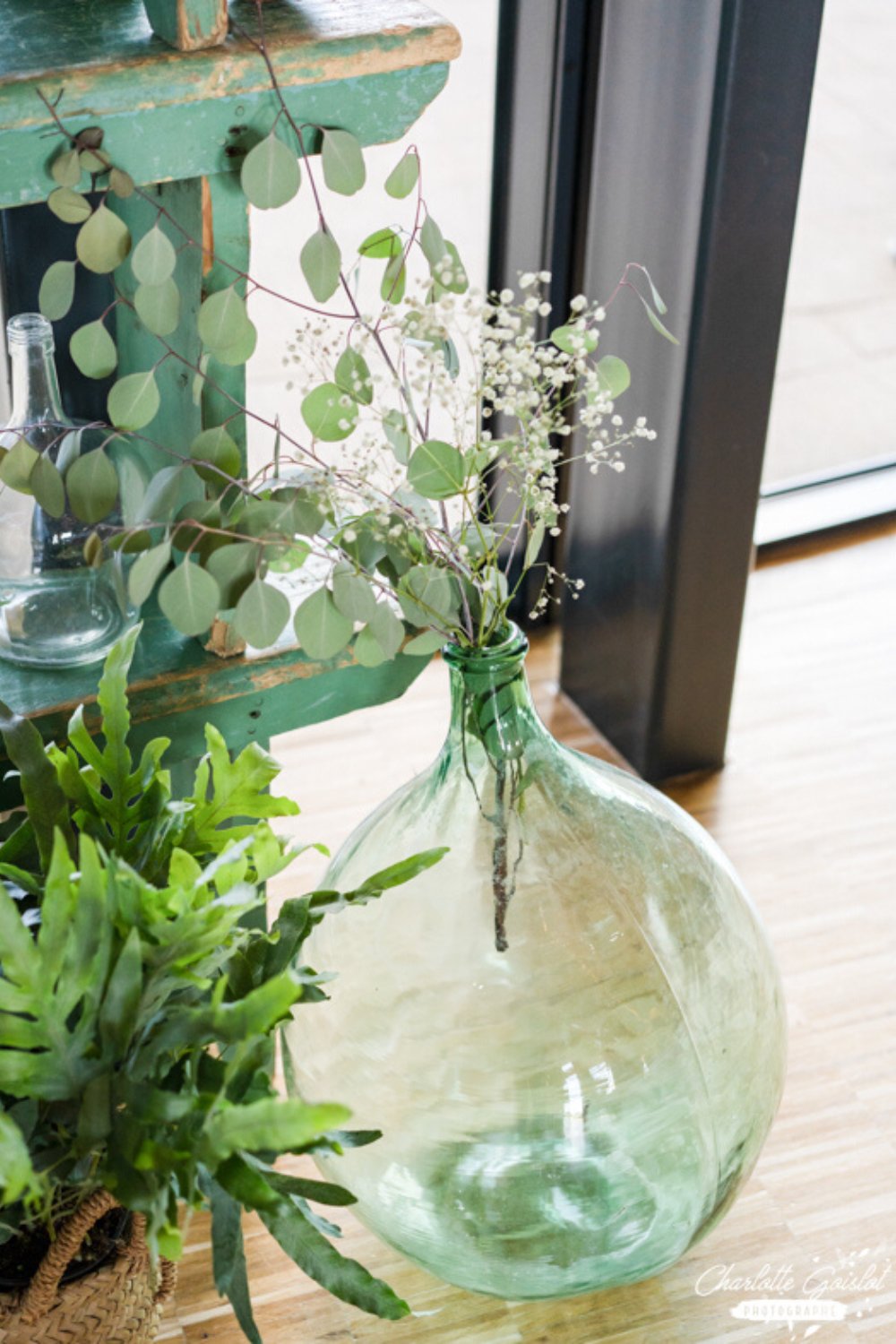 Nous avons ajouté des dames-Jeannes vertes et transparentes (petites et grandes), des paniers fleuris, des plantes vertes, des succulentes, des fougères, de l’eucalyptus, de vieux livres, des pots et bougeoirs en cuivre, en terre cuite et en verre, ainsi que des lanternes.