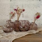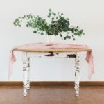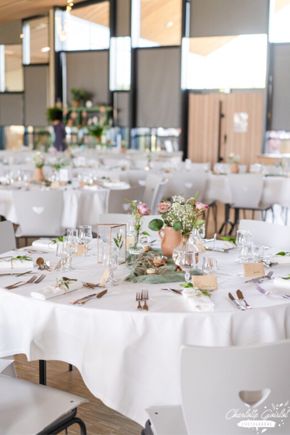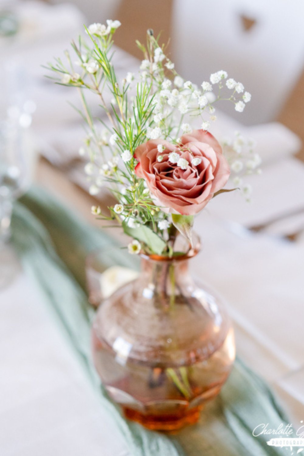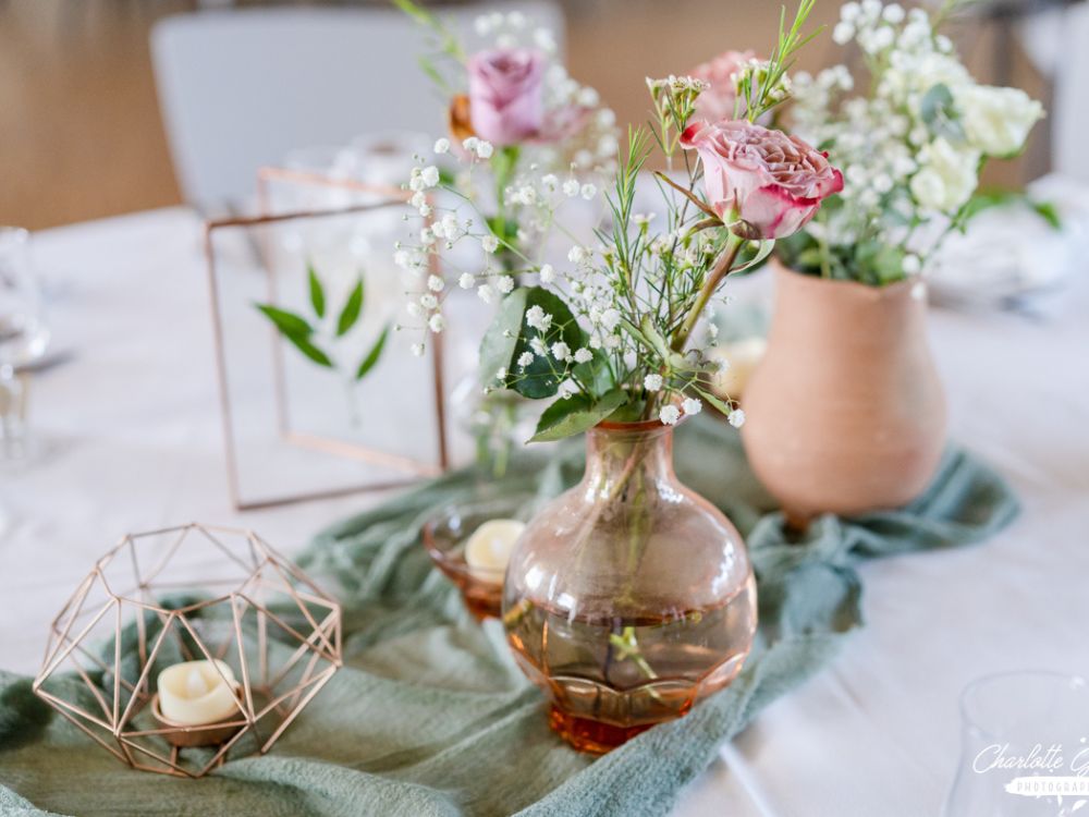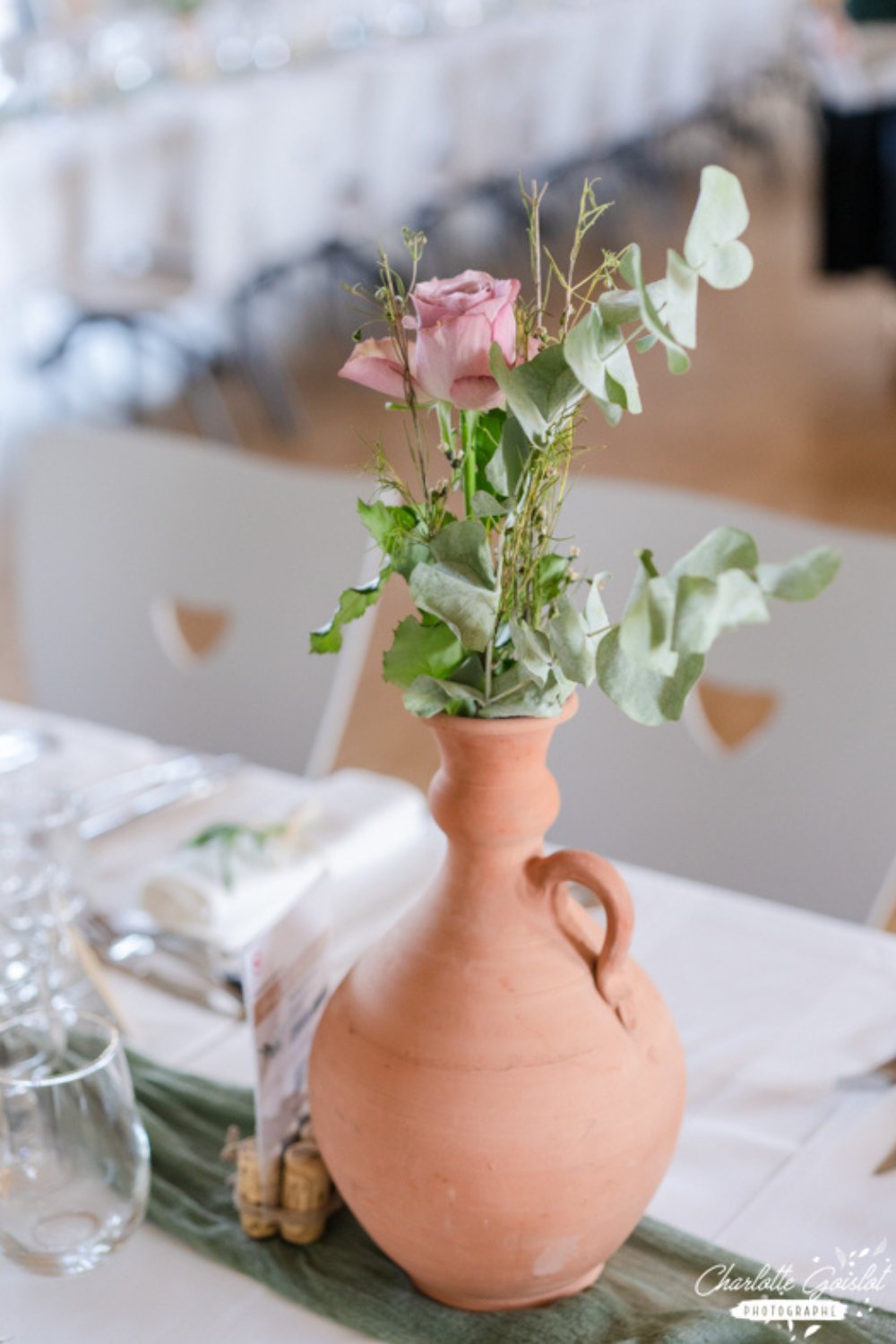 Mais aussi des vases roses, verts, transparents ainsi que des pichets en terre cuite, coloris terracotta. Chaque vase était fleuri, avec des roses blanches ou rose pâle, de l’eucalyptus, et de la gypsophile, puis déposé sur les tables.
