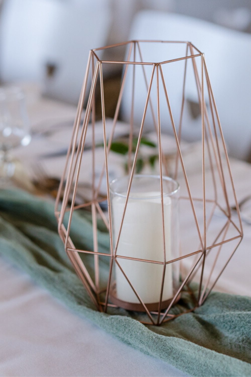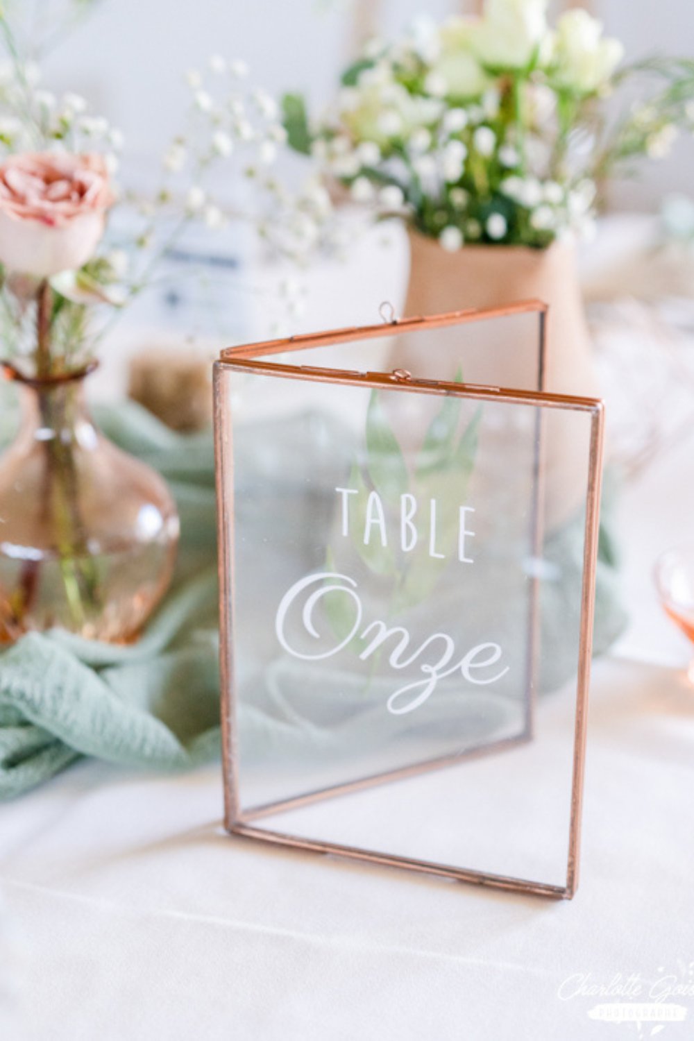 Au centre de chaque table, nous avons ajouté un photophore cuivré, une coupelle en verre rose, avec une bougie et des cadres en verre cuivrés. Sur ces derniers, nous pouvions lire le numéro de la table écrit dessus. Des feuillages avaient été glissés dans chaque cadre, toujours dans l’idée d’apporter une petite touche végétale et d’harmoniser l’ensemble.
