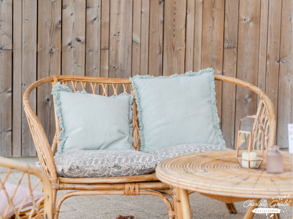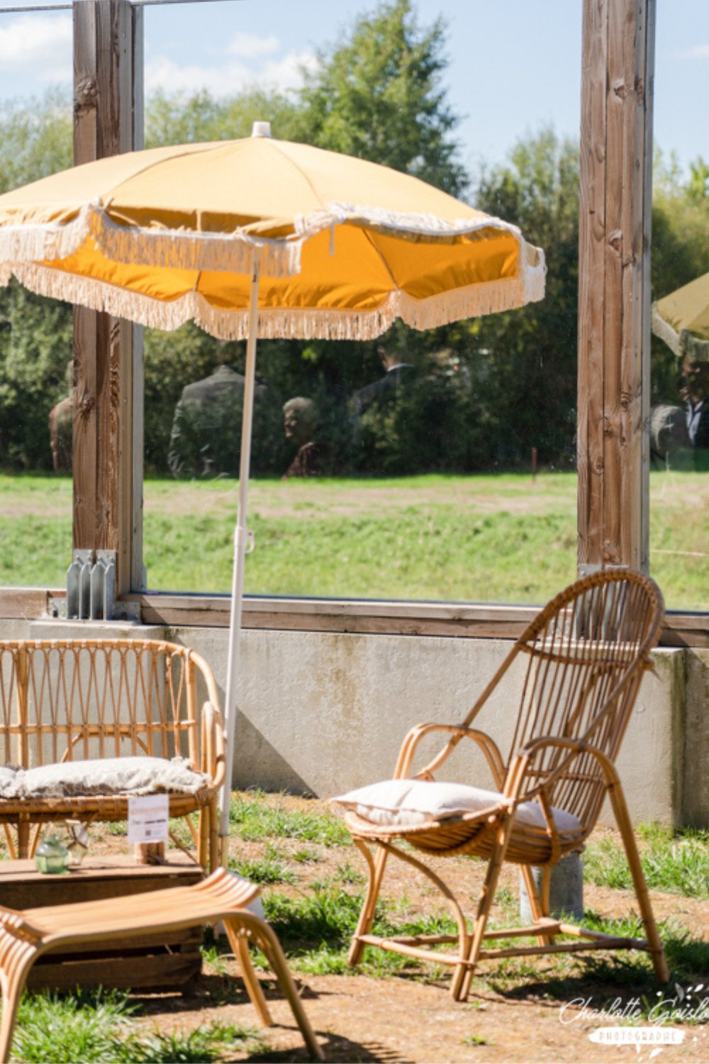 L’espace cocktail a été installé dans les jardins de la salle, avec un bar à jus frais, ainsi que de petits espaces détentes avec notre salon en rotin “Marie”, nos parasols “Marisol”, nos banquettes et fauteuils en rotin.