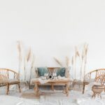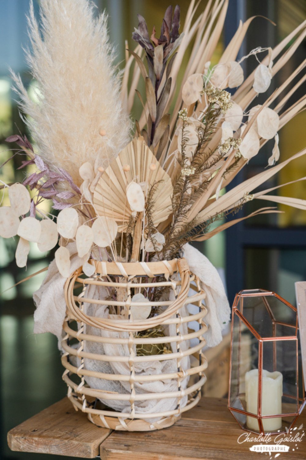 Nous avons ajouté un tapis, toujours pour délimiter l’espace, une dame-jeanne et quelques pampas