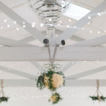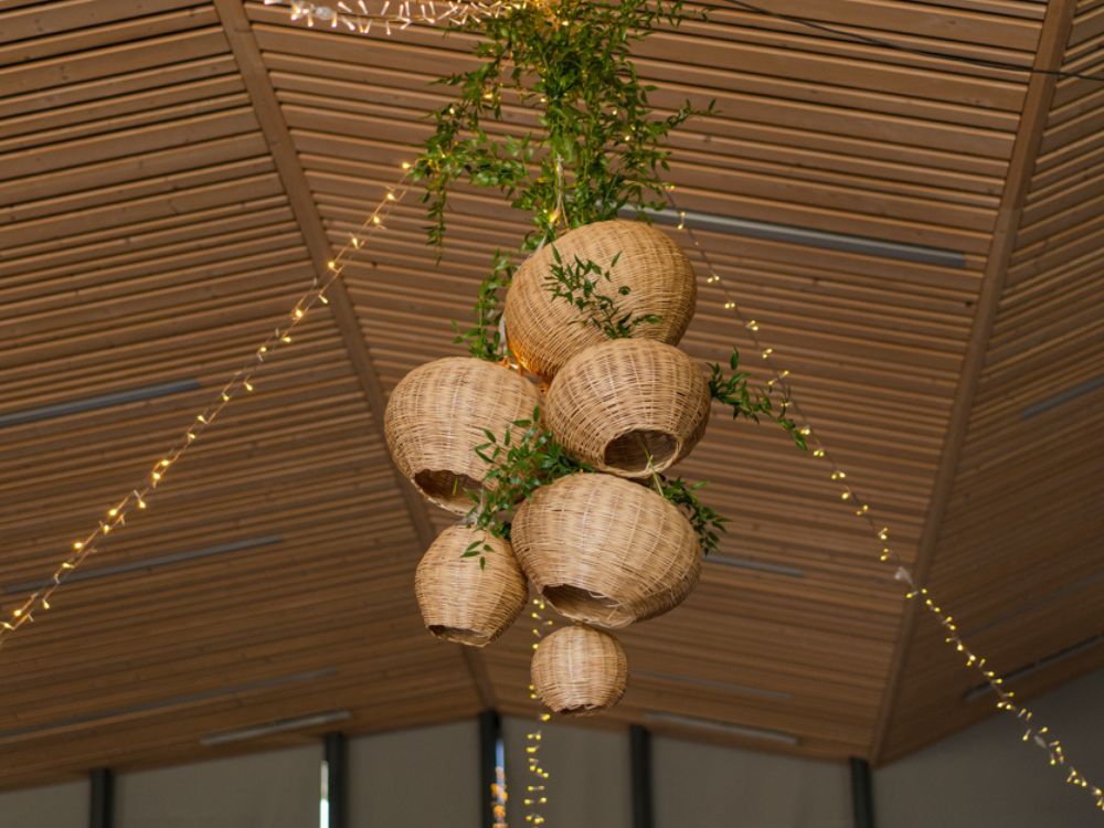 Pour assurer la continuité de l’ambiance dans la salle de réception, nous avons végétalisé avec des feuillages nos suspensions en rotin “Jama”, dans le but d’apporter une touche végétale au plafond. Grâce à la pose d’un ciel lumineux sur les filins, nous avons pu apporter une lumière chaleureuse au lieu.