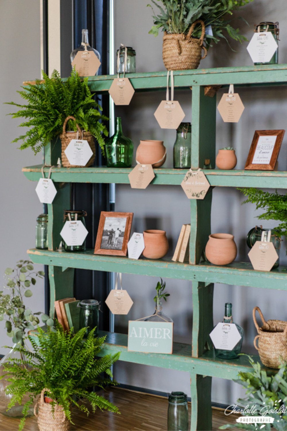 Le plan de table a été réalisé avec nos bancs en bois verts « Love in the air ». Une fois qu’ils étaient superposés, il ne nous restait plus qu’à les décorer avec divers objets et à y accrocher, avec de jolis rubans de couleur crème, la papeterie réalisée avec l’atelier de création “Pastille et Petits Pois”.