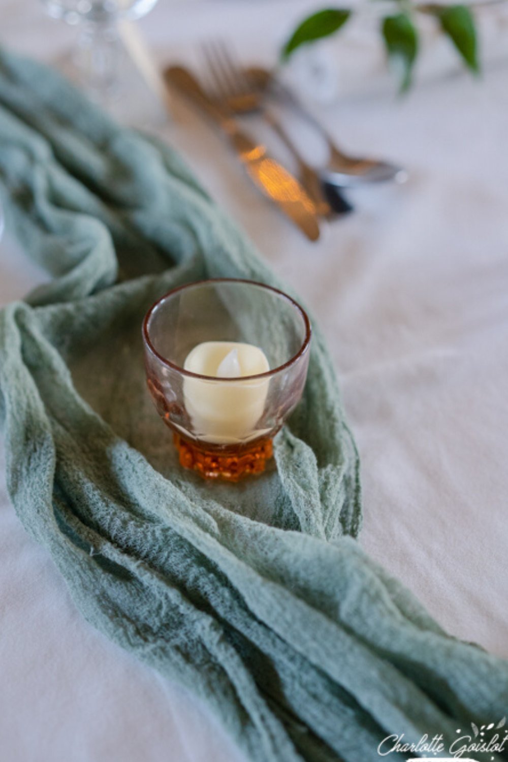 Toujours dans l’idée d’une décoration végétale et naturelle, nous avons disposé sur des tables rondes, des nappes blanches, sur lesquelles nous avons installé un chemin de table en gaze de coton vert d’eau.