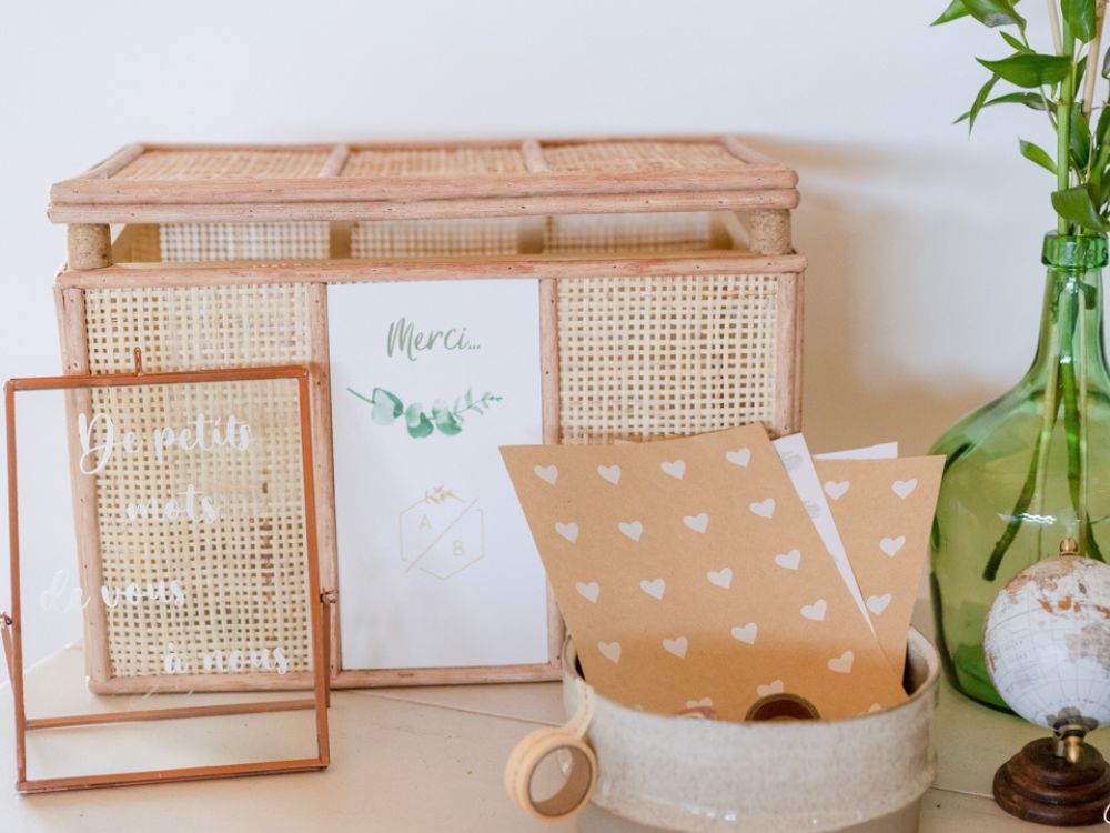 Nous avons également ajouté une signalétique à l’aide d’un cadre cuivré sur lequel il était inscrit “De petits mots de vous à nous”. Concernant la cagnotte, nous avons customisé un petit coffre en cannage et bois pour créer une fente (le couvercle a été surélevé avec des bouchons), afin que les invités puissent y glisser leurs mots doux.