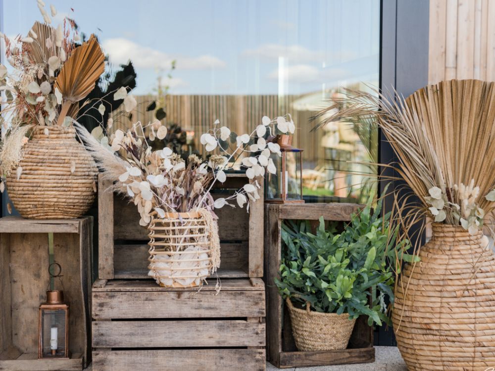 Des caisses en bois ont été réparties à différents endroits de cet espace, ainsi que des paniers fleuris, des lanternes en rotin et d’autres petits objets décoratifs.
