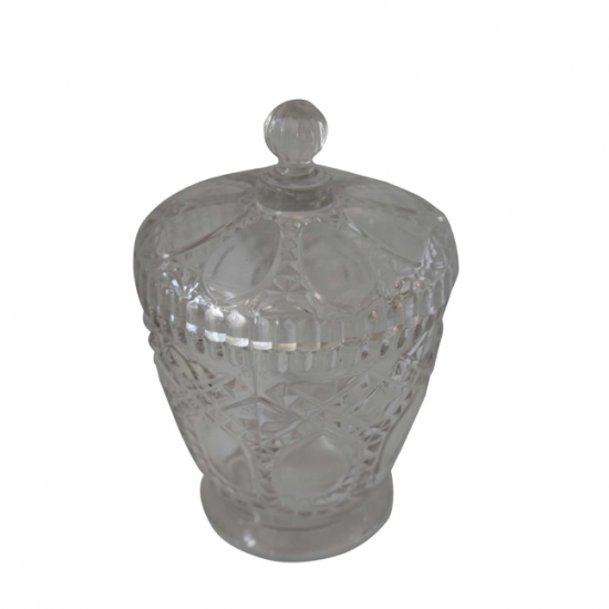 Une jolie bonbonnière en verre travaillé, pouvant servir également de contenant pour vos fleurs si le style vous plait. H18,5 x D11,5