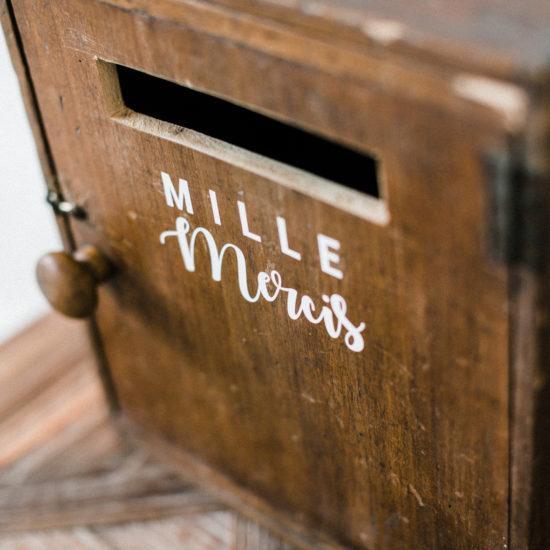 Jolie cagnotte avec ce lettrine blanc « Merci » pour votre urne pour récolter les jolis mots de vos convives !
