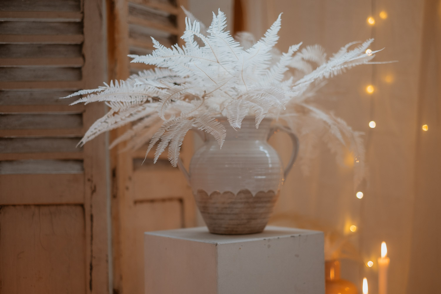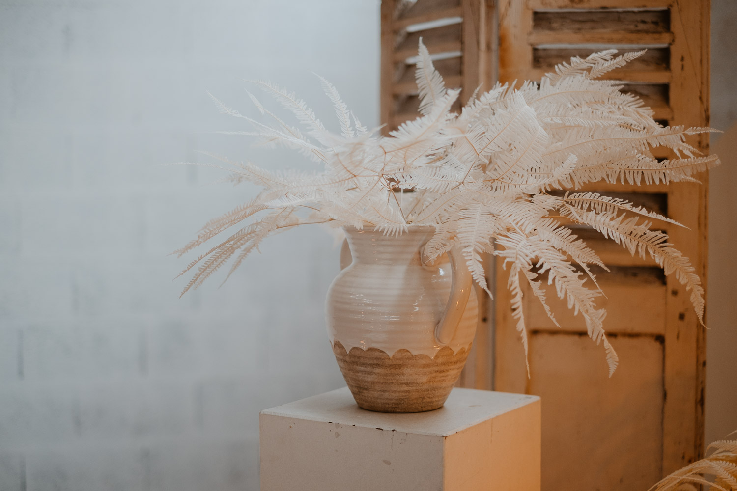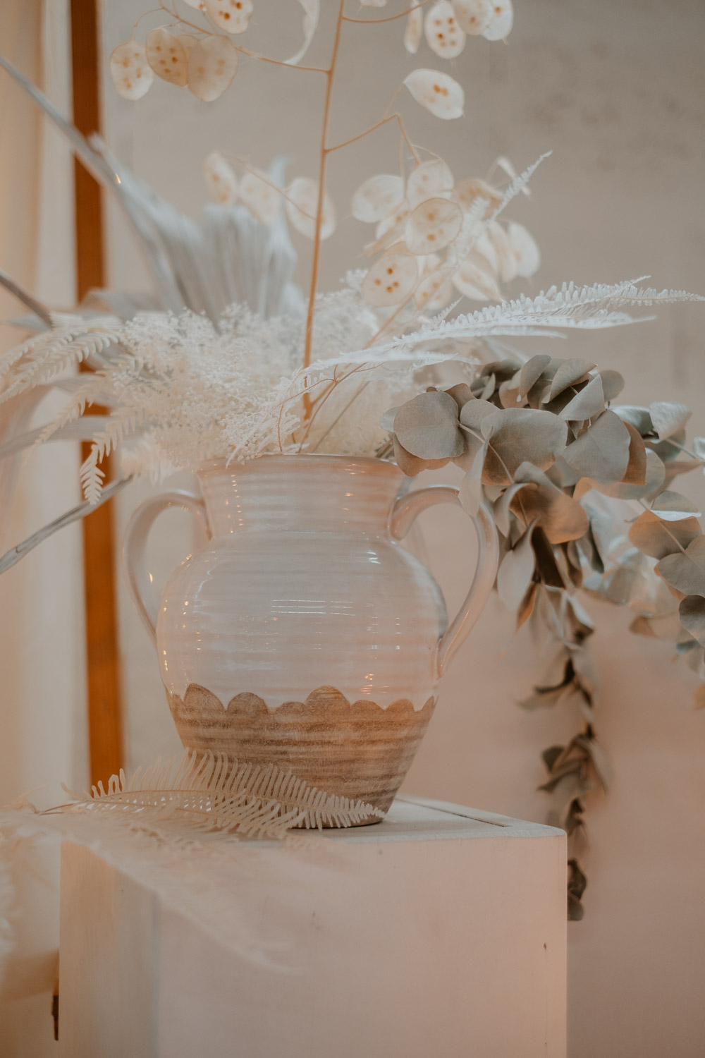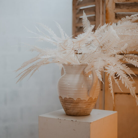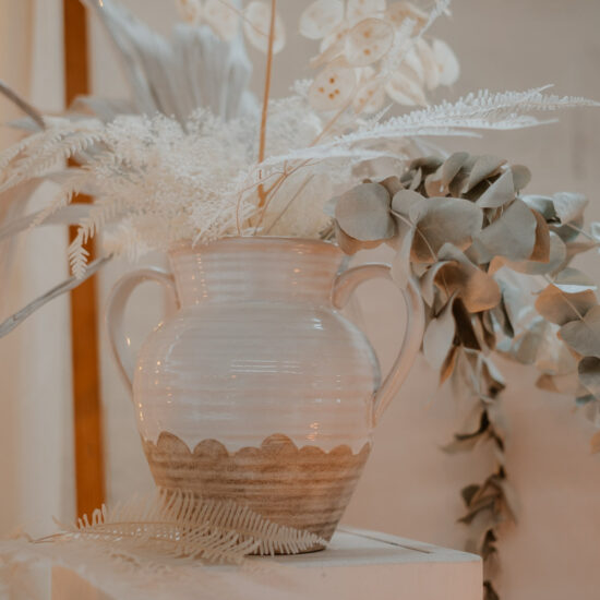 Vase en grès blanc et naturel avec 2 anses. Il est parfait pour accueillir une grosse composition florale, pour décorer un buffet ou une cérémonie par exemple.