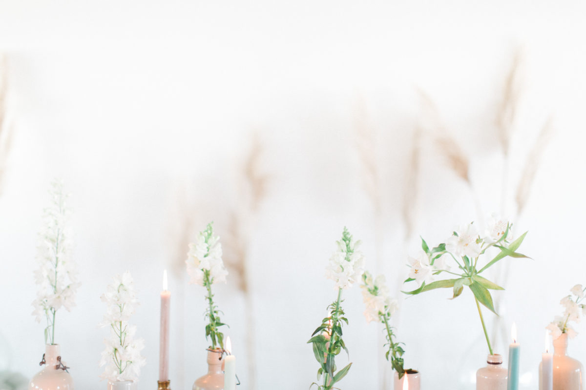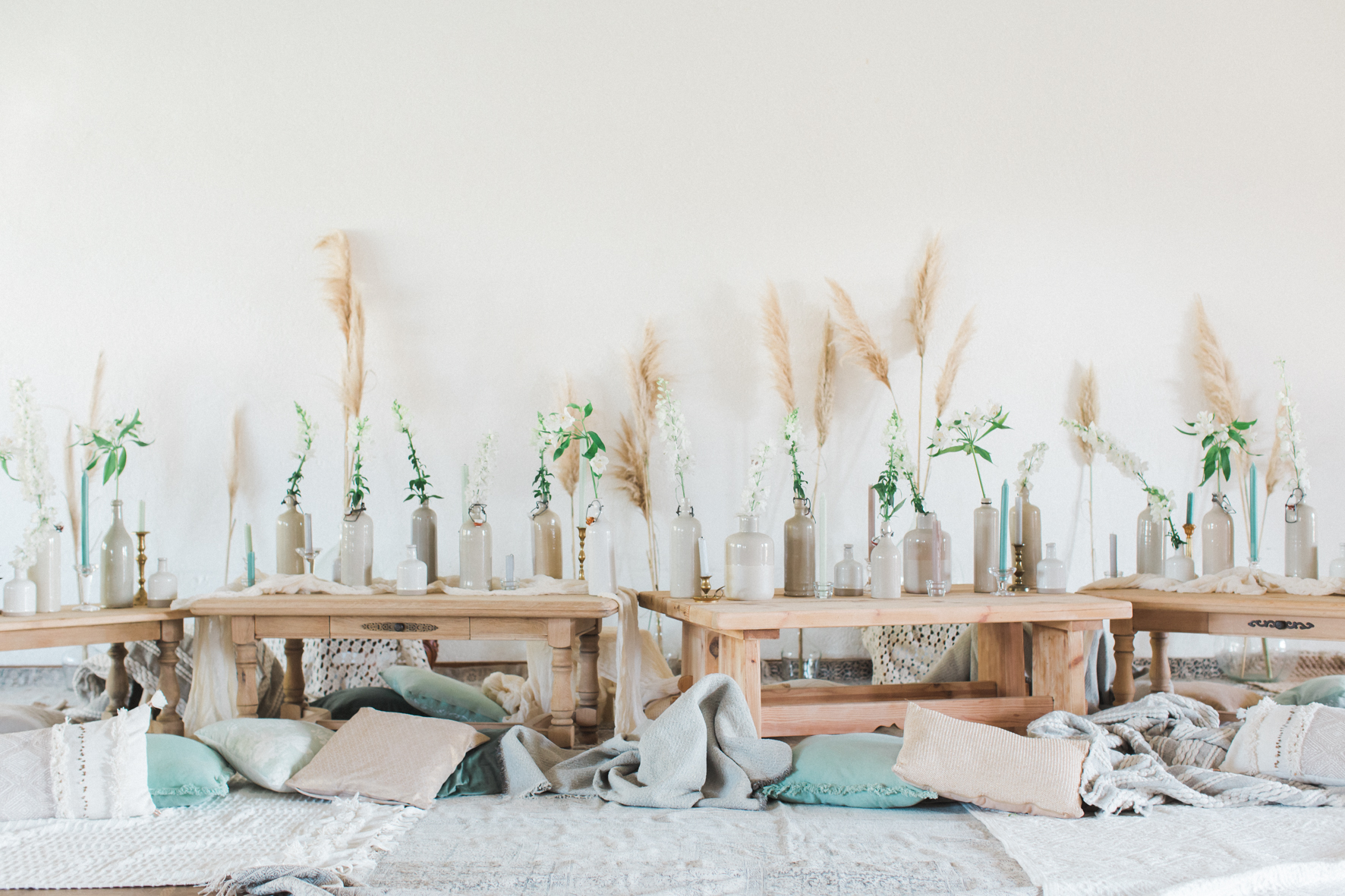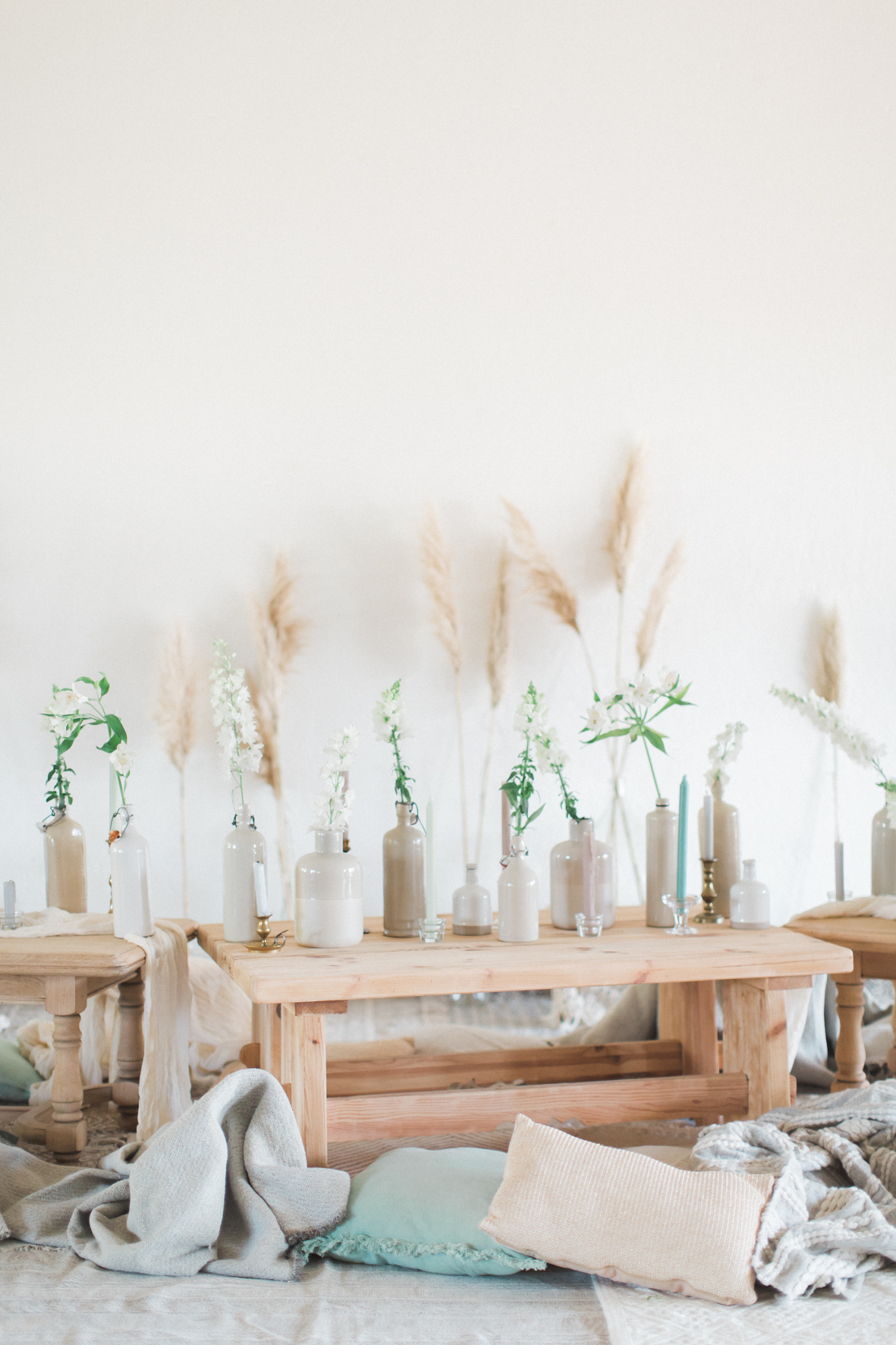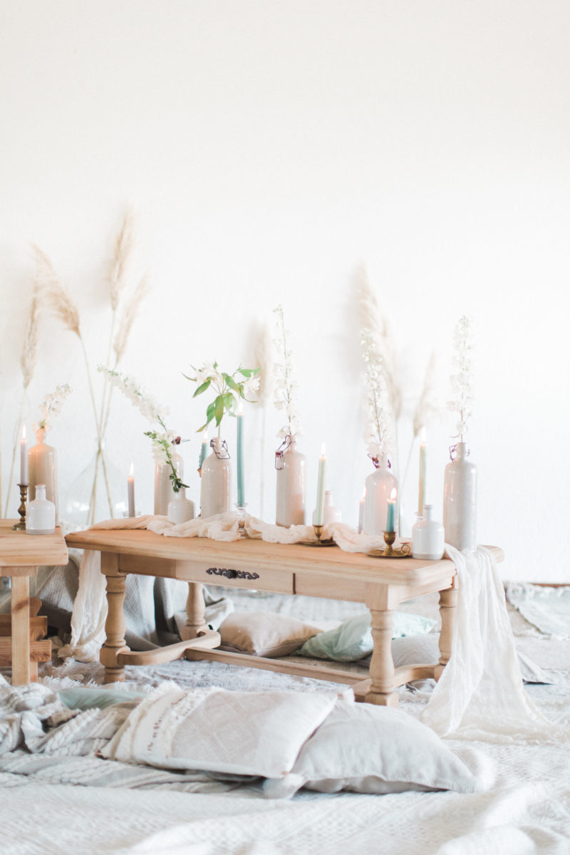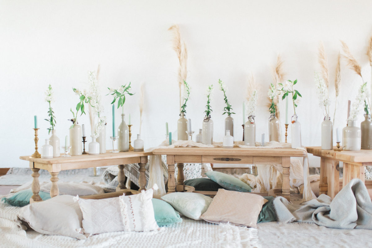 Je me suis amusée à créer l’ambiance d’un mariage bohème comme je le rêve. Un dîner en petit comité avec les gens qu’on aime le plus : élégant mais d’une grande simplicité ! Une belle lumière : via un code couleur clair . des jeux de matières : lin, laine, gaze & coton. Un mobilier unique, chiné & retravaillé avec amour : tables basses, chandeliers or, vases. Des fleurs à la coupe délicatement disposées : pampa, lysianthus … & mes bests : Dame Jeanne, bouillotte en grès & lin