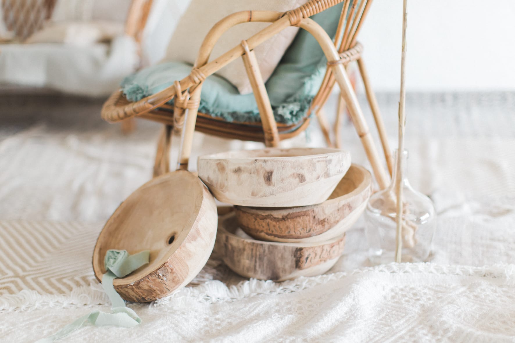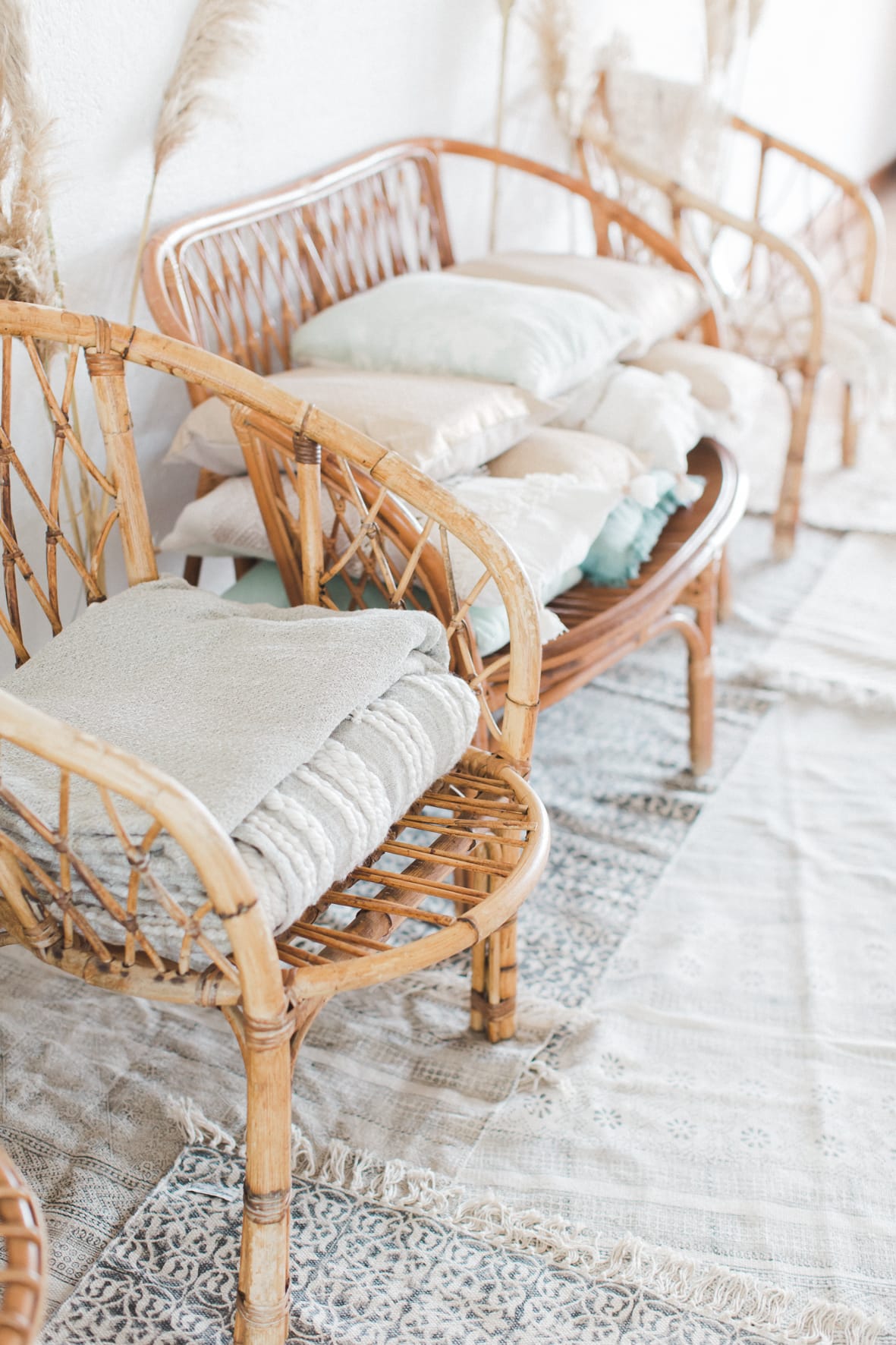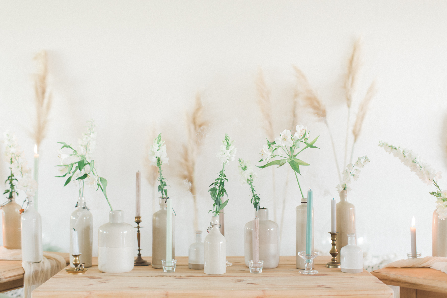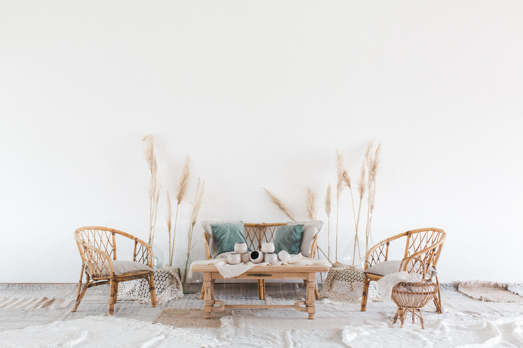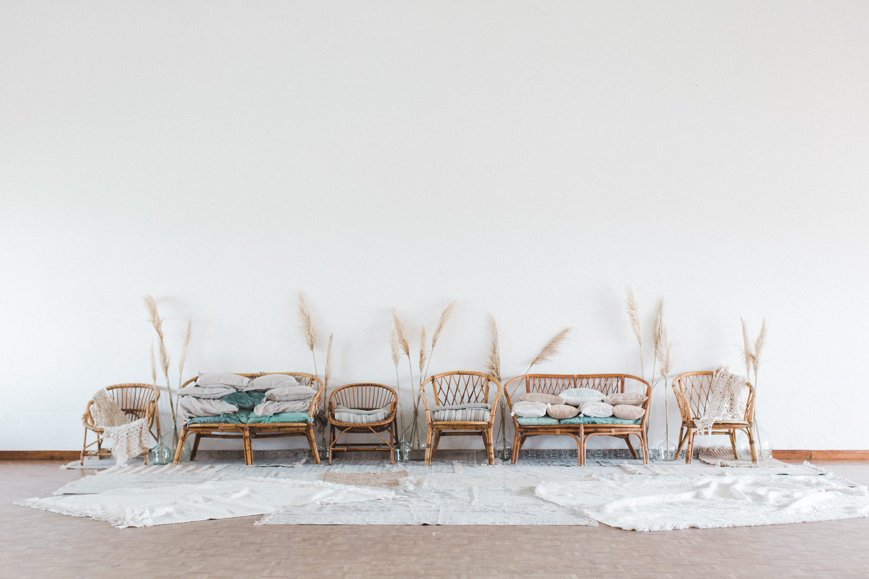 Je me suis amusée à créer l’ambiance d’un mariage bohème comme je le rêve. Un dîner en petit comité avec les gens qu’on aime le plus : élégant mais d’une grande simplicité ! Une belle lumière : via un code couleur clair . des jeux de matières : lin, laine, gaze & coton. Un mobilier unique, chiné & retravaillé avec amour : tables basses, chandeliers or, vases. Des fleurs à la coupe délicatement disposées : pampa, lysianthus … & mes bests : Dame Jeanne, bouillotte en grès & lin