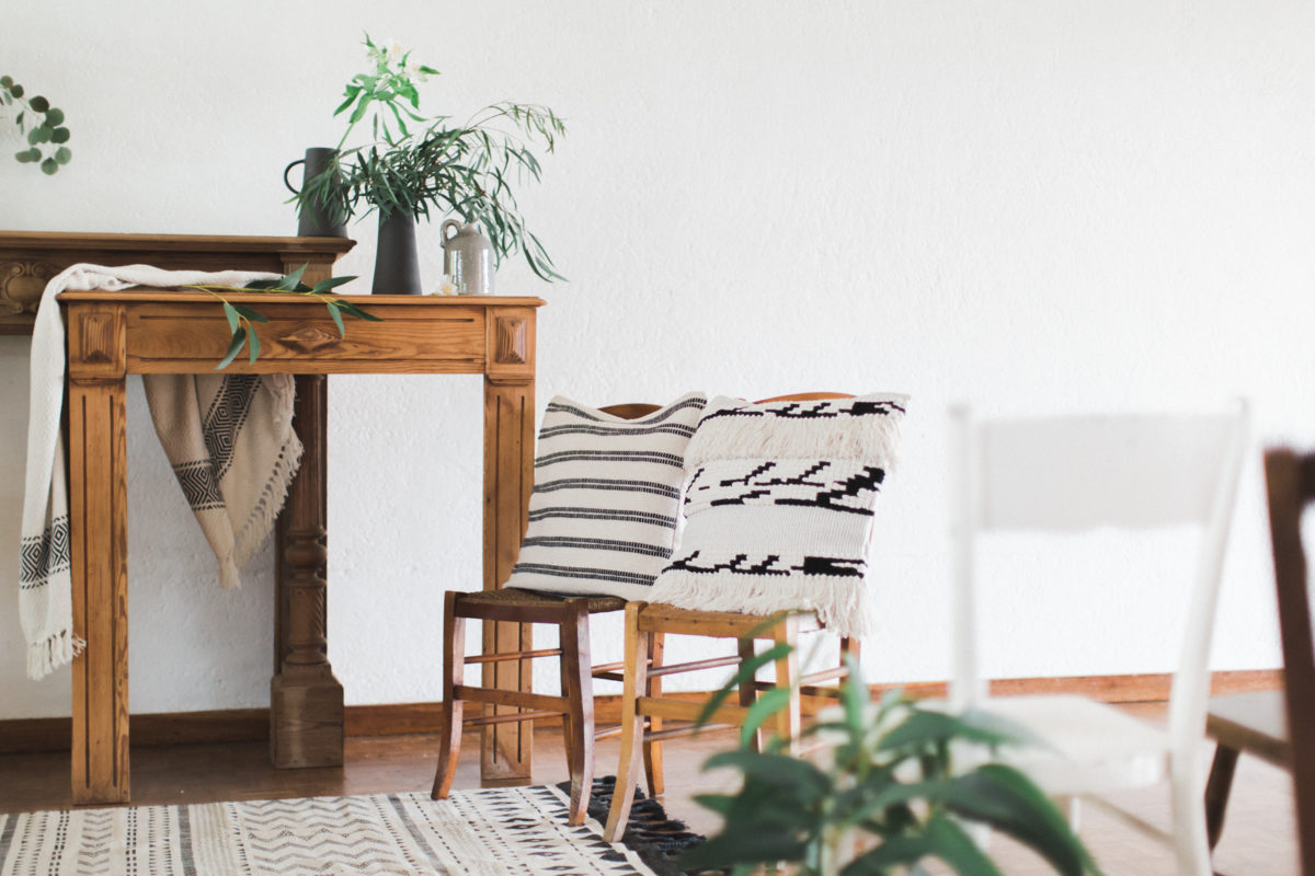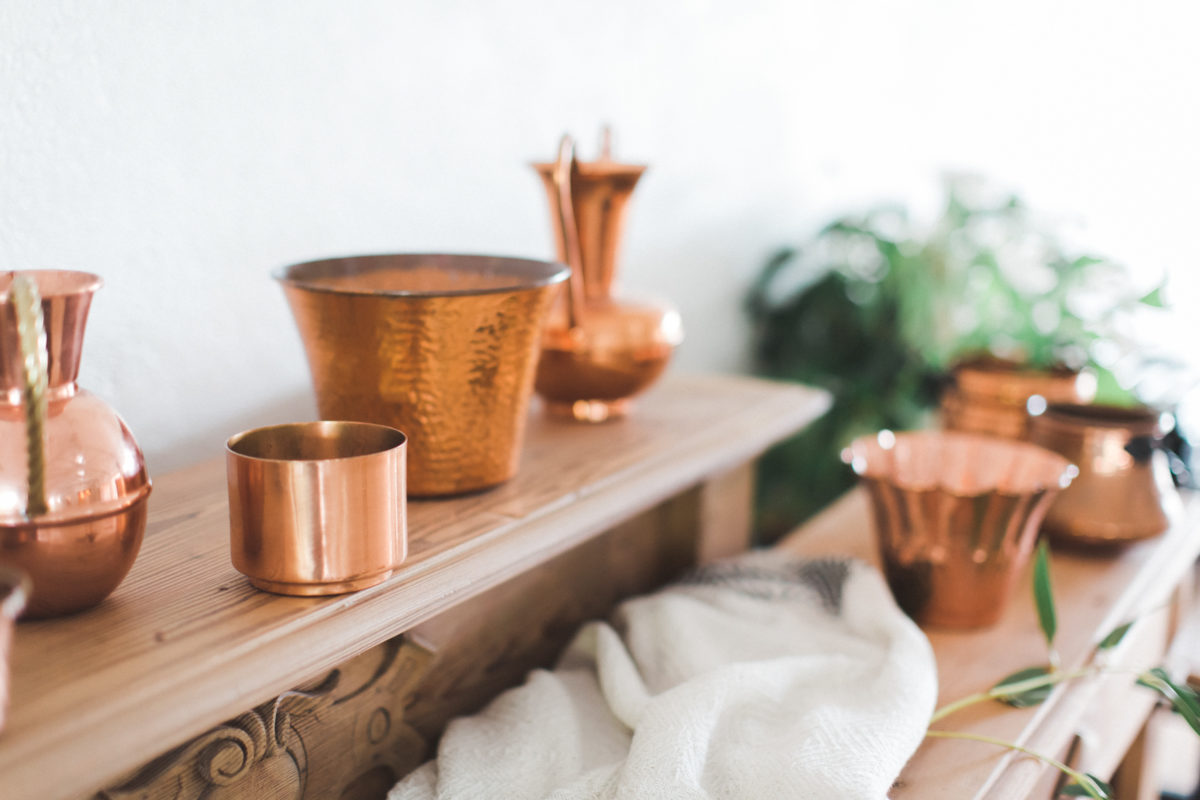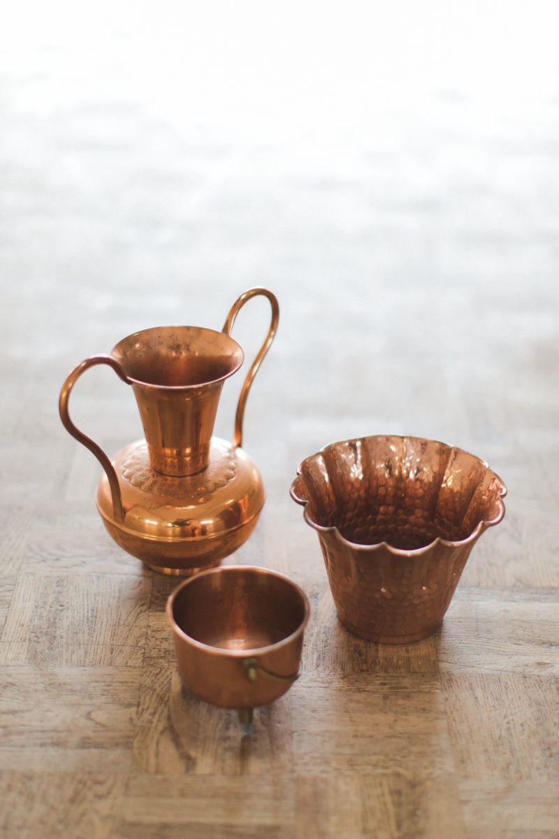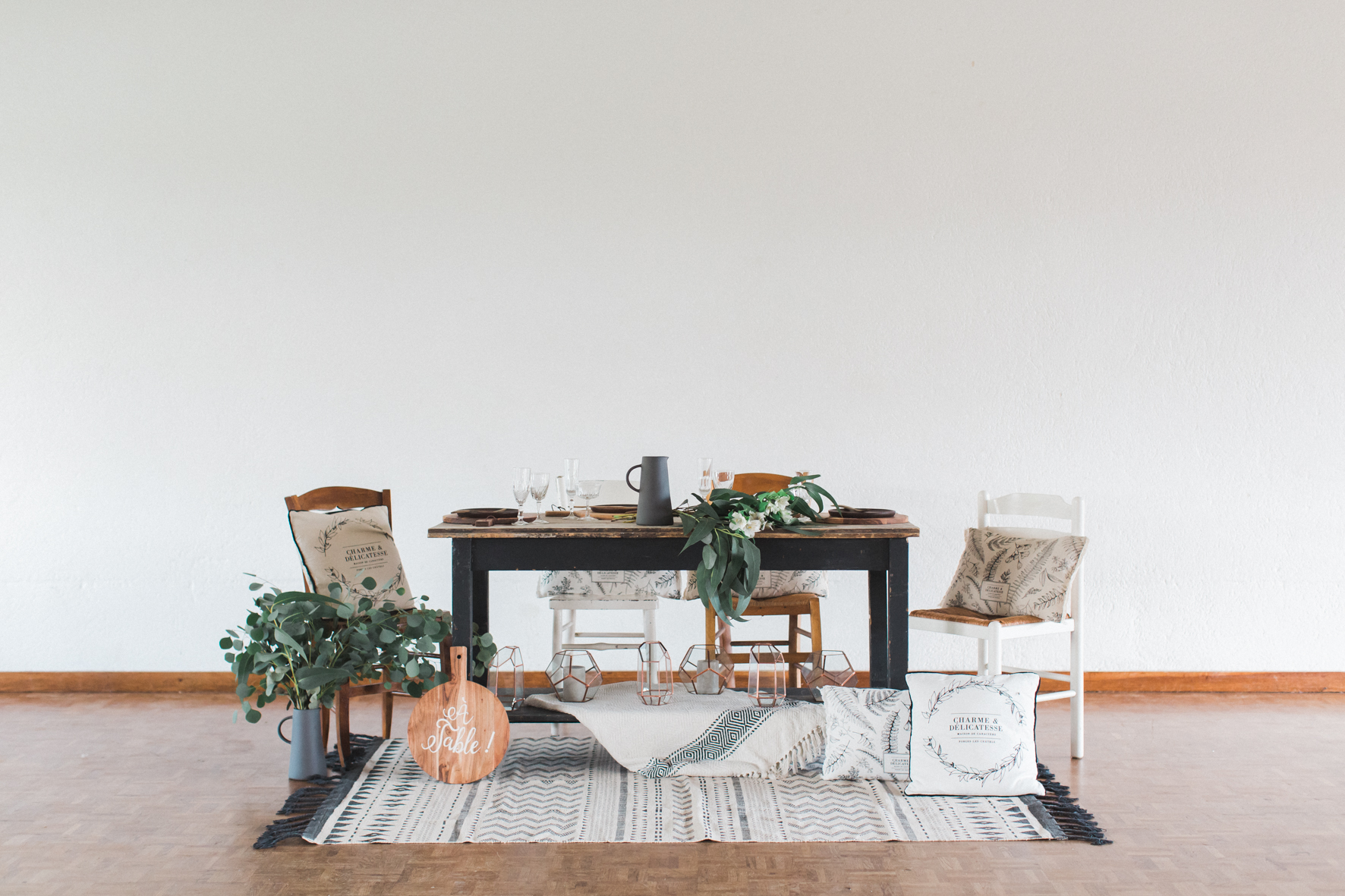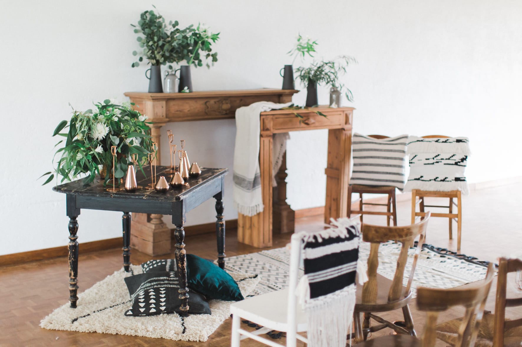 Manteaux de cheminée, la belle sélection de meubles noirs et bois d’un de mes brocanteurs favoris , macramé bi -couleur, vase grès noir aux lignes très fines, vieux cache pot Cuivre, chandelles modernes couleur cuivre, chaises bois et blanches, tapis aux formes géométriques … Cette alliance Noir & Blanc mêlée au cuivre et au bois nous emporte dans un univers moderne mais très chaleureux.