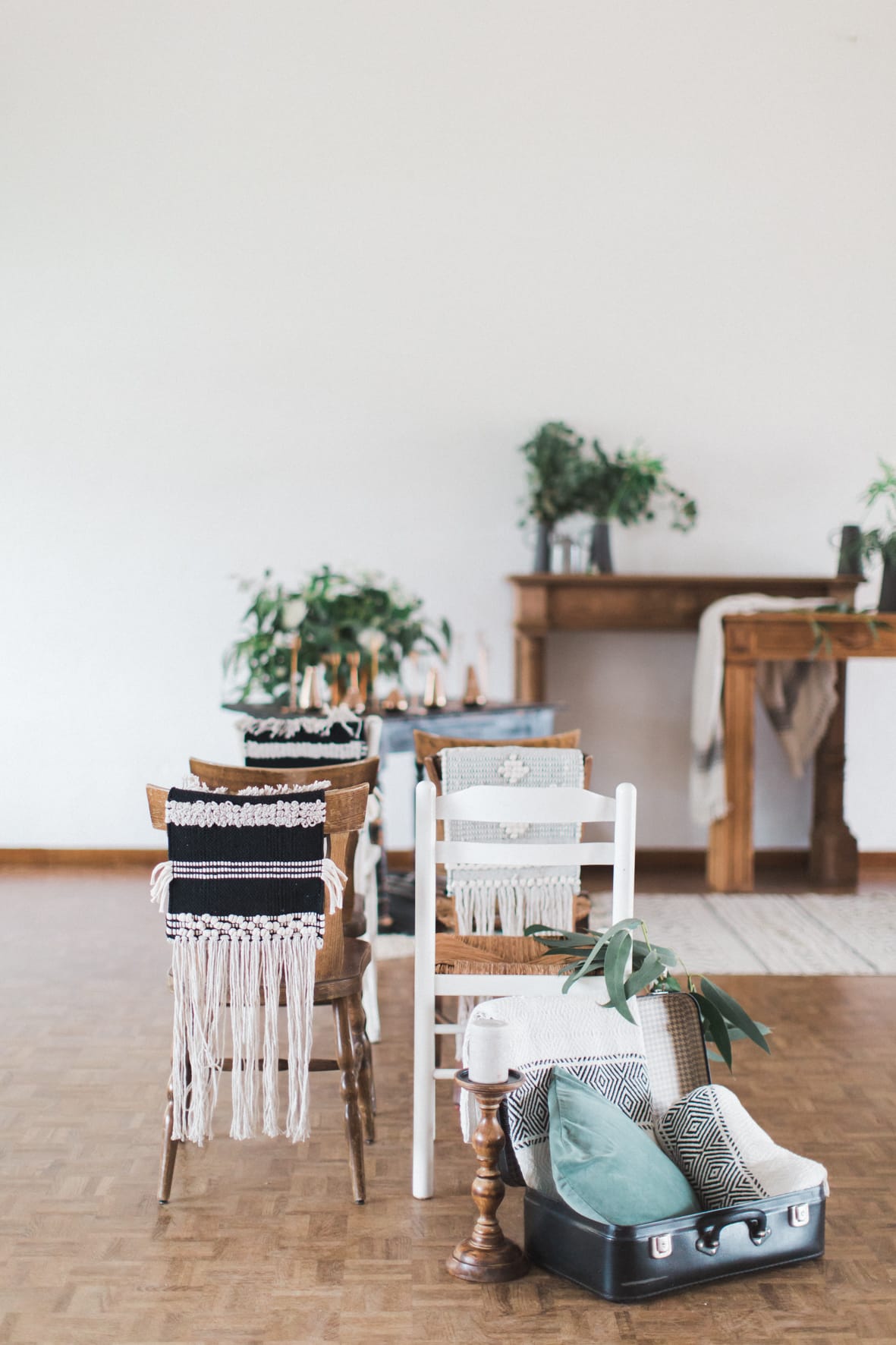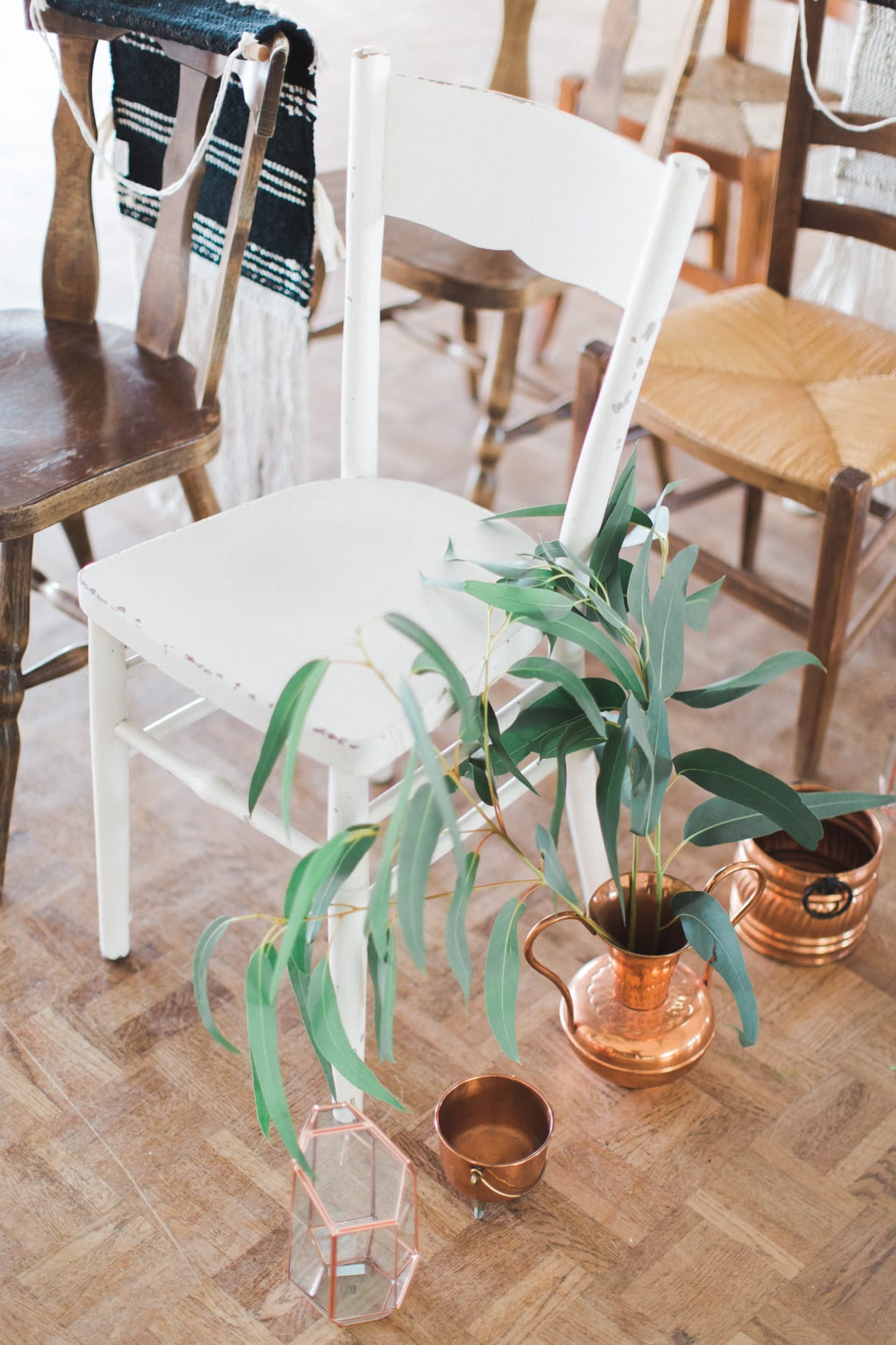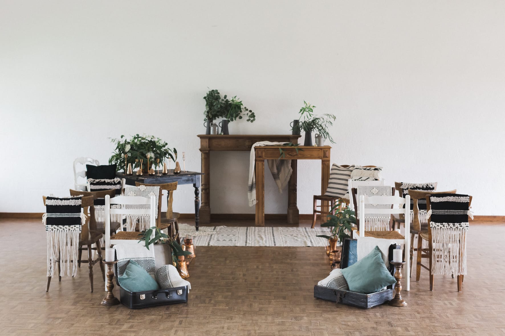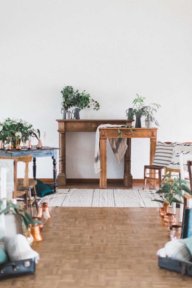 Manteaux de cheminée, la belle sélection de meubles noirs et bois d’un de mes brocanteurs favoris , macramé bi -couleur, vase grès noir aux lignes très fines, vieux cache pot Cuivre, chandelles modernes couleur cuivre, chaises bois et blanches, tapis aux formes géométriques … Cette alliance Noir & Blanc mêlée au cuivre et au bois nous emporte dans un univers moderne mais très chaleureux.