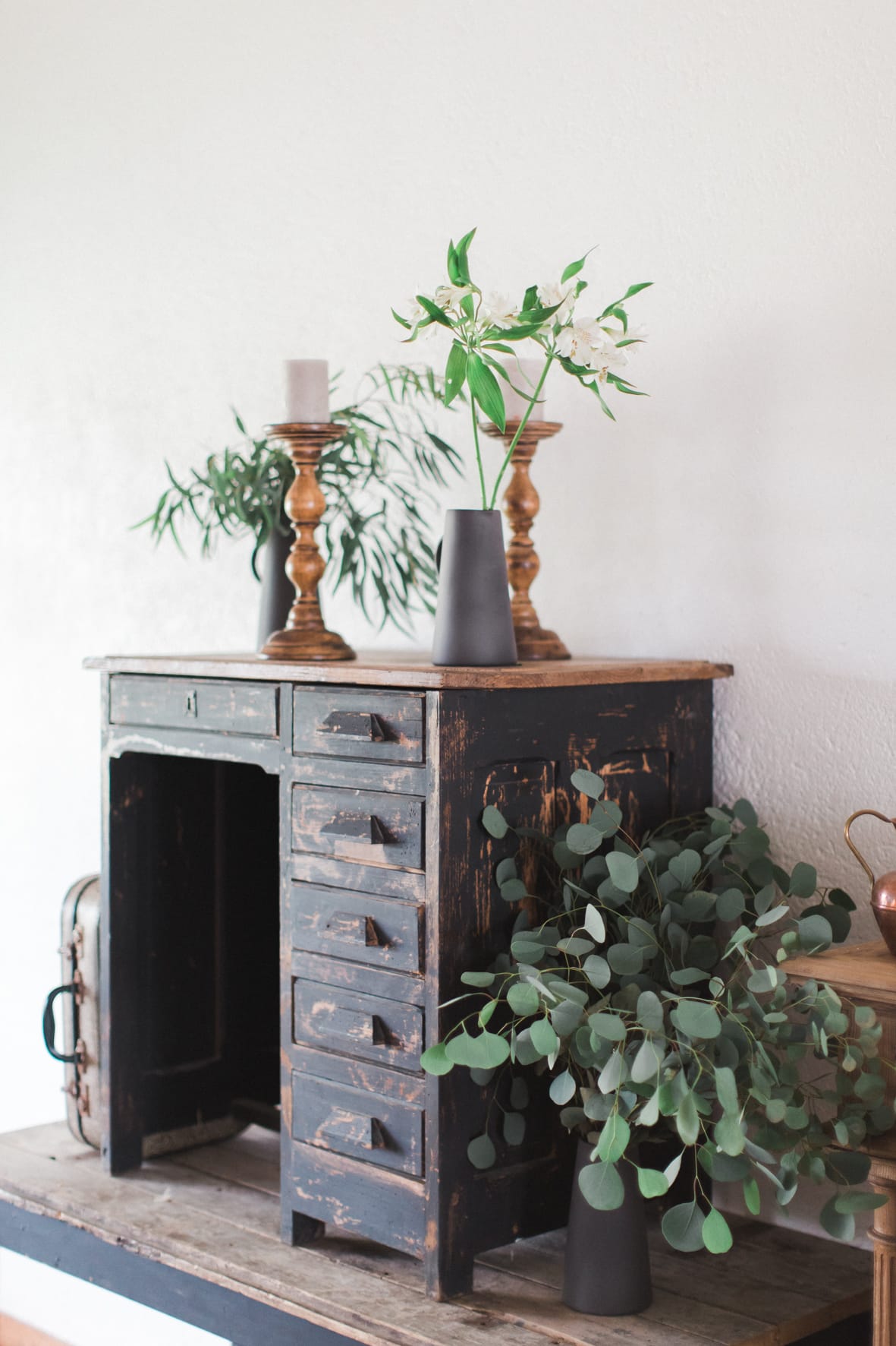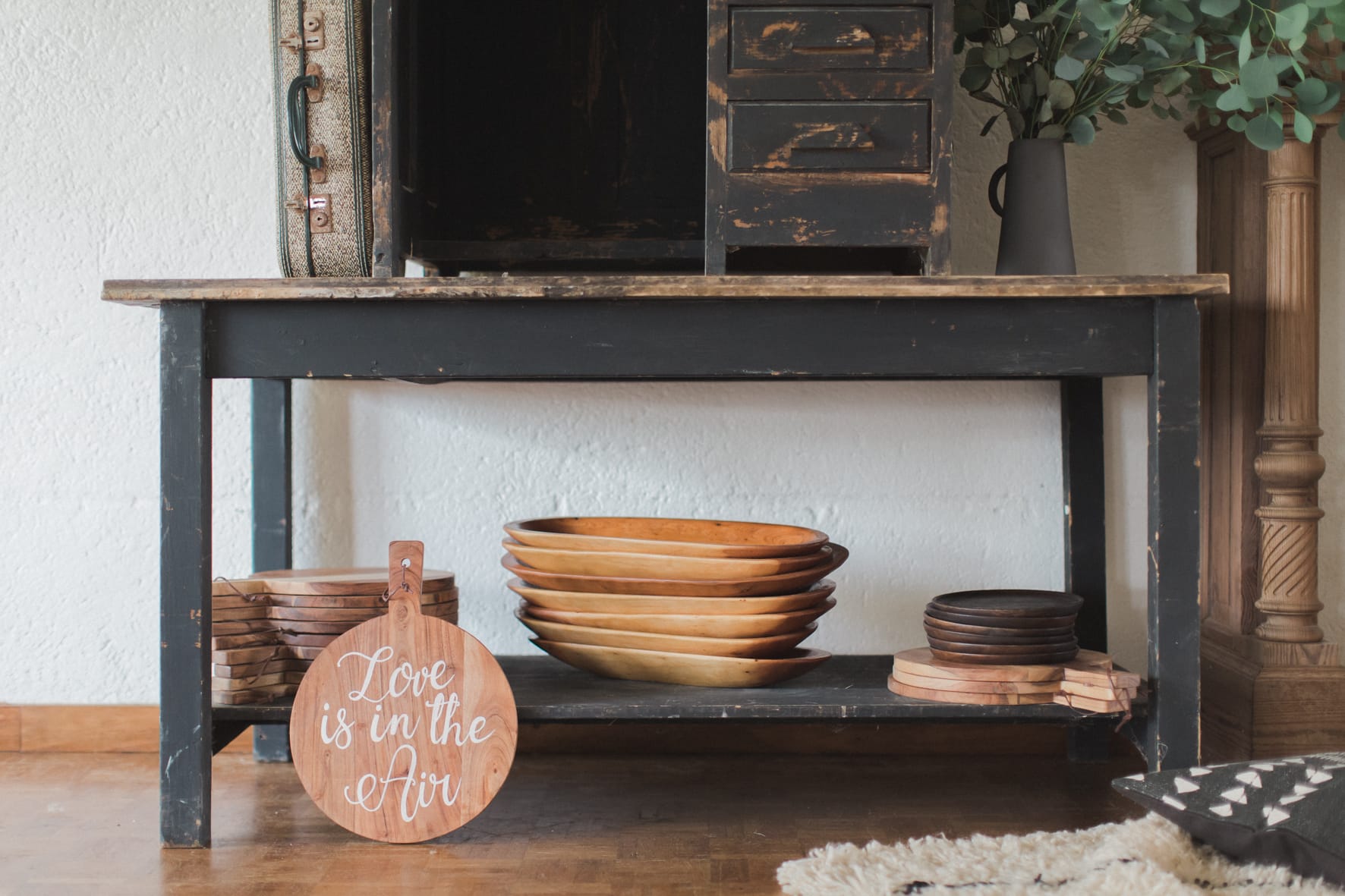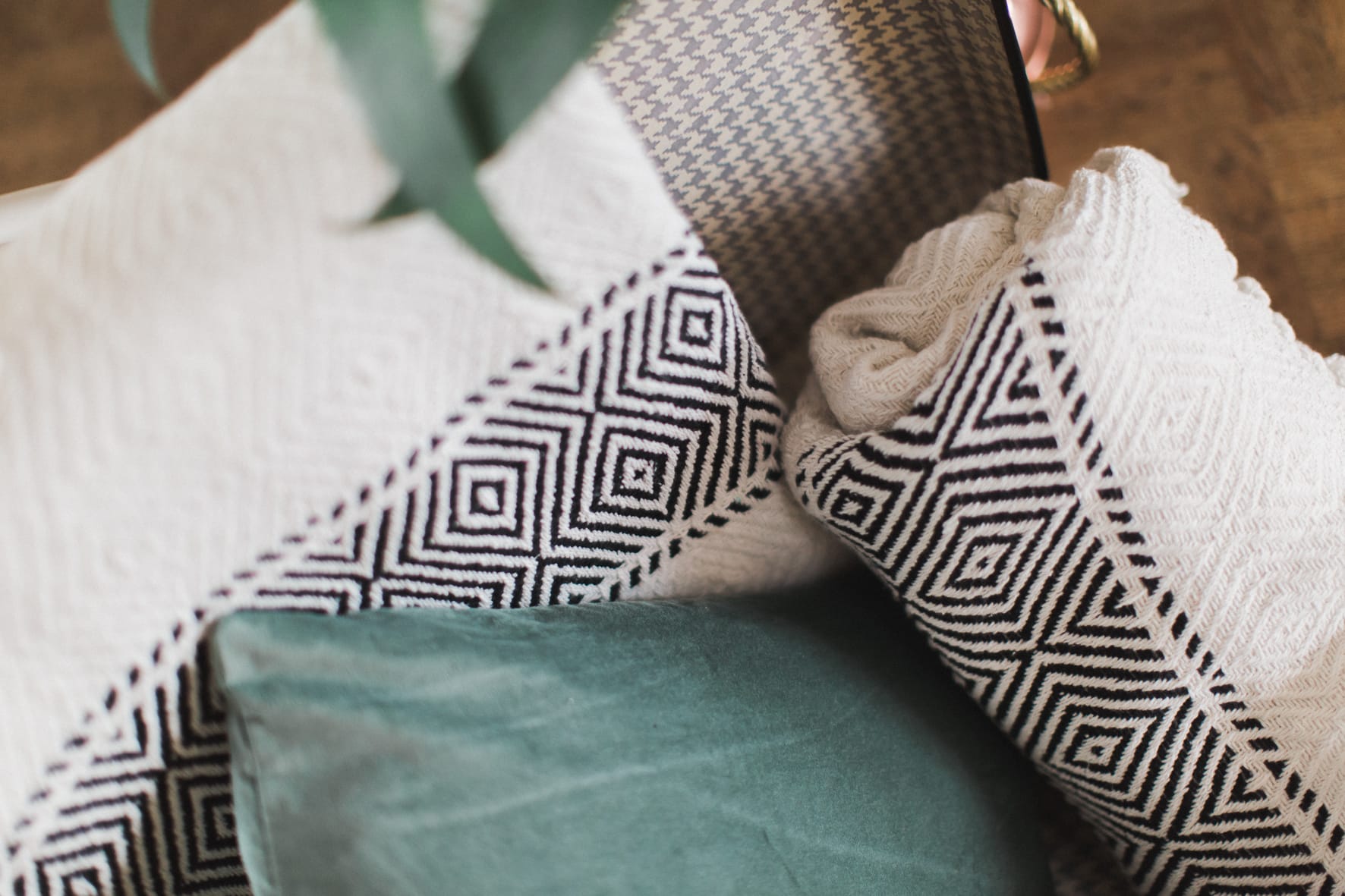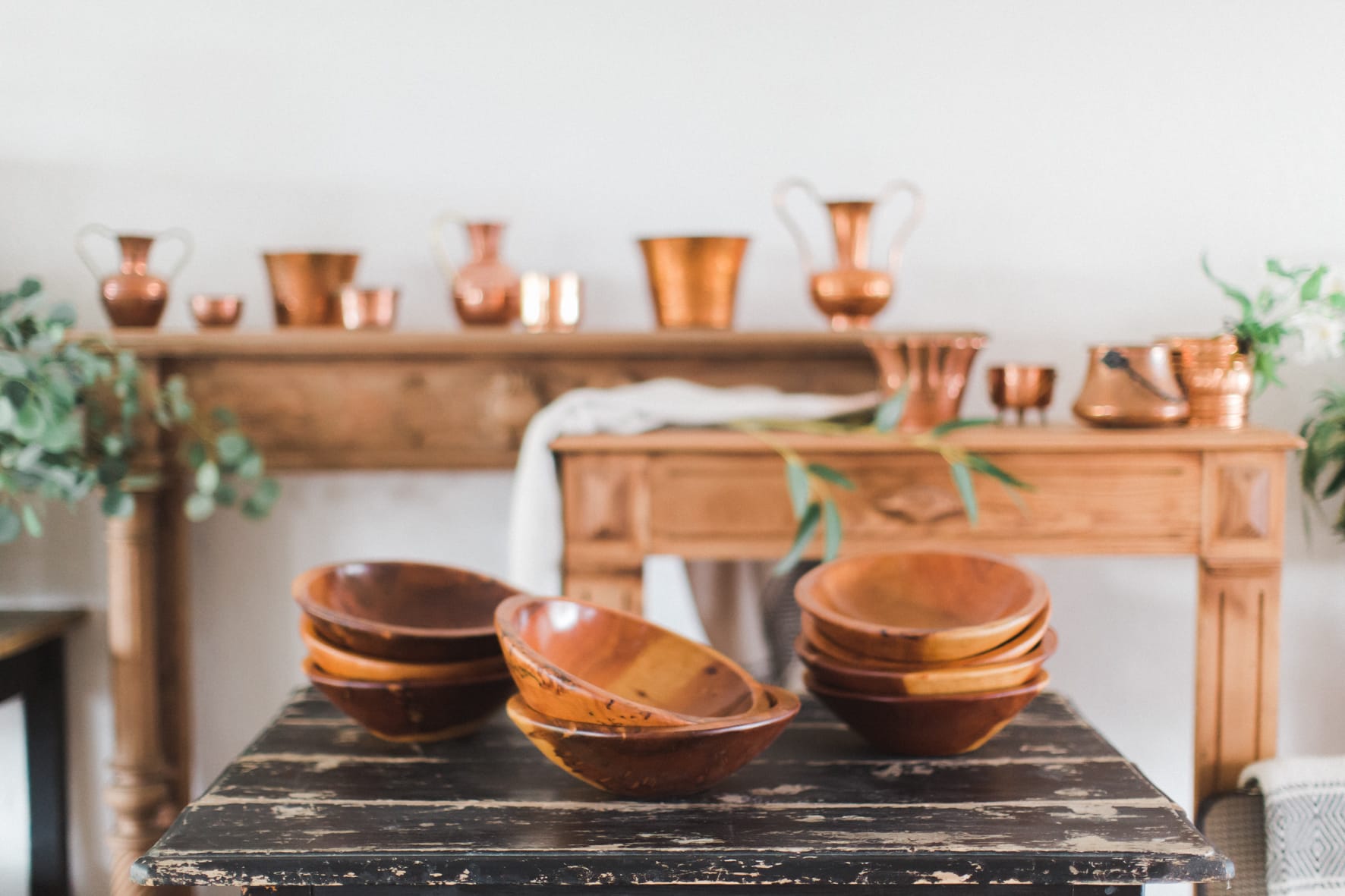 Manteaux de cheminée, la belle sélection de meubles noirs et bois d’un de mes brocanteurs favoris , macramé bi -couleur, vase grès noir aux lignes très fines, vieux cache pot Cuivre, chandelles modernes couleur cuivre, chaises bois et blanches, tapis aux formes géométriques … Cette alliance Noir & Blanc mêlée au cuivre et au bois nous emporte dans un univers moderne mais très chaleureux.